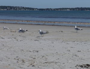 Breakfast on the beach: Seagulls enjoying the morning on the beach with washed up clams, making an easy breakfast. Photo taken on Long Beach, Nahant, Massachusetts with the city of Lynn in the distance. 300px