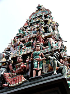 temple deities looking down, architectural, artistic, beliefs, bird, characters, colorful, coloring, colors, colourful, colouring, colours, creatures, culture, decorated, decorations, decorative, deities, demi-gods, Dirt, dirty, display, figures, gods, Hindu, Hindu temple, Hinduism, neglected, ornamental, ornamentation, ornaments, pigeon, religion, religious, rooftop, scenes, statues, temple, wear and tear, weathered, worn