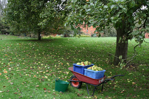 Windfall apples, apple, autumn, collect, England, garden, gather, harvest, Malus, orchard, tree, wheelbarrow, windfall