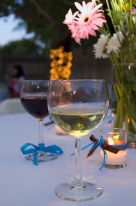 Wine at Twilight, blue, cafe, candle, dining, drink, drunk, evening, fine, flowers, food, glass, glasses, meal, outdoors, red, ribbon, table cloth, vino, white, wine