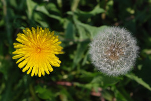 Maturing Dandelions 2: Dandelions, a very common weed in many parts of the world. The flower matures into a ball of filaments carrying away achenes with seeds. 300px
