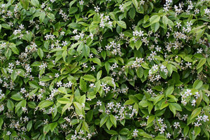 So-called jasmine (Trachelospermum jasminoides) in flower in a garden in England.