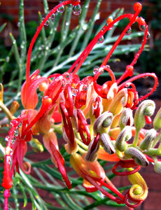 waterdrops tangle: rain drops on Australian grevillea shrub red flowers 300px