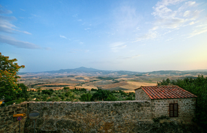 City of Pienza, Tuscany. View to Monte Amiata near Sunset. City Wall in Foreground.