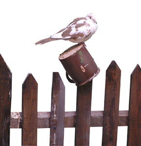 Pigeon, animal, bird, brown, cutout, desk, desks, fence, isolated, pigeon, plank, planks, pot, rest, sit, white