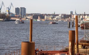 Hamburg Harbour: Panorama view over the harbour in Hamburg. You see the coastline, a lot of ferry traffic and some metal, rusty dolphins in the front. 300px