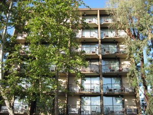 Hotel facade, balconies, balcony, building, hidden, hotel, house, rest, shelter, terrace, terraces, trees, windows