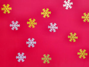 snowflake flag1: red surface with coloured symbolic snowflakes 300px
