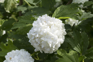 Viburnum flowers: A flower pompom of Viburnum opulus in a garden in England. 300px