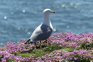 Gull: A herring gull (Larus argentatus) amongst thrift (Armeria) on the coast of Pembrokeshire, Wales. 300px