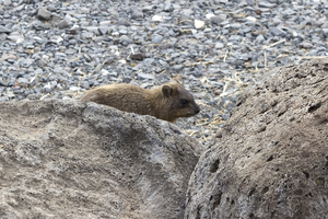 Rock hyrax: A rock hyrax (Procavia capensis) outside its burrow under a boulder in Galilee, Israel. 300px