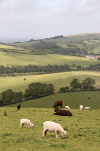 Farm landscape, animal, calf, countryside, cow, domesticated, England, english, farm, feed, field, graze, grazing, Great Britain, hill, hillside, lamb, landscape, livestock, mammal, meadow, sheep, South Downs, Sussex