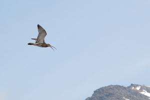 Curlew: A curlew (Numenius arquata) flying over the Lofoten Islands, Norway. 300px