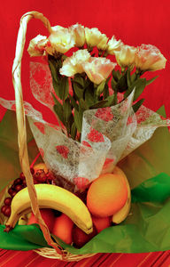 fruit & flower basket1, apples, bananas, basket, care, color, colored, colorful, colors, colour, coloured, colourful, colours, decoration, decorative, edges, edging, floral, flowers, food, fresh, fresh-fruit, frilly, fruit, gift, grapes, healthy, lisianthus, nutritional, nutritious, oranges, plant, plums, present, well-wishes, wrapping